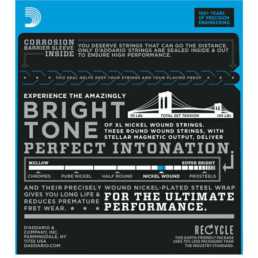 As cordas para guitarra com enrolamento de níquel D 19Addario XL são reconhecidas mundialmente como a escolha dos grandes músicos, entre guitarristas de todos os gêneros e estilos. São feitas de aço banhado a níquel e enroladas com alta precisão ao redor de uma alma hexagonal, resultando em uma corda com inconfundível timbre brilhante e excelente afinação.